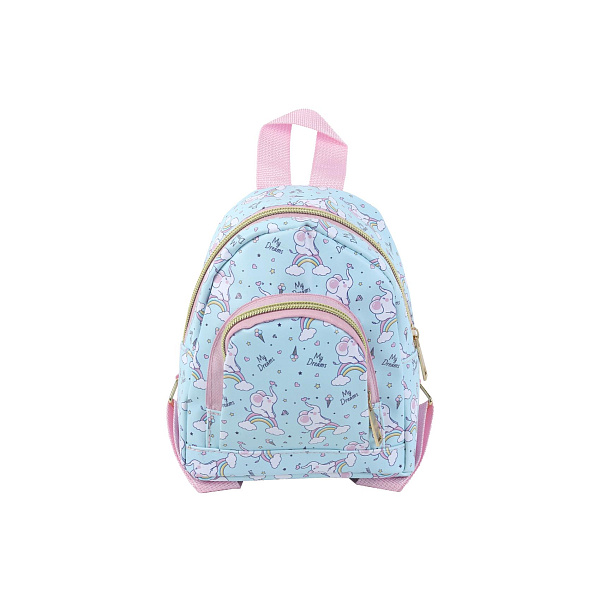 Детский рюкзак оформлен в нежных голубых тонах с радужным принтом игривых слоников и надписями «My Dreams». Цвет молний – золотистый, а розовые акценты на молниях и ручке гармонично сочетаются с общим дизайном. Лямки регулируемые, выполнены в розовом цвете, обеспечивают удобство ношения и возможность регулировки под рост ребенка.