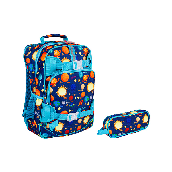 Красивый и вместительный рюкзак в комплекте с пеналом – отличный комбо-набор для юного школьника. Оригинальная расцветка и принт с планетами на синем фоне, голубые декоративные элементы привлекают внимание и создают хорошее настроение. Широкие мягкие лямки с регуляторами длины равномерно распределяют нагрузку на плечи и позвоночник. Для переноса рюкзака в руках предусмотрена специальная ручка. Рюкзак имеет большое основное отделение и плоский наружный карман для мелочей. Карманы застегиваются на молнию. По бокам рюкзака располагаются наружные карманы для напитков с сетчатой вставкой и резинкой. Изюминкой рюкзака является светоотражающая полоска, которая повышает безопасность на дорогах. В комплект входит пенал, выполненный из такой же ткани, как и рюкзак. Пенал вместительный, закрывается на молнию.