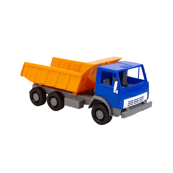 Кузов изготовлен из желтого пластика и ярко контрастирует с синей кабиной, а также откидывается для быстрой разгрузки. Три оси с большими колесами обеспечивают хорошую проходимость машины даже в условиях игры в песочнице или на газоне.