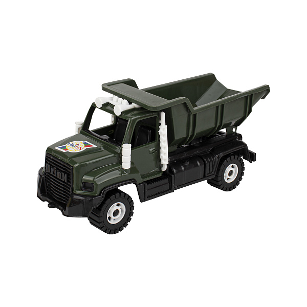 Модель самосвала изготовлена на основе шасси с 2-х местными сидениями и панелью управления. Игрушка оснащена 4 колесами с белыми декоративными колпачками, установленными на кронштейнах шасси. С обеих сторон от кабины присутствуют фильтры и выхлопы, на крыше – клаксон, а спереди автомобиля – ребристая облицовка. На шасси с буксирным кольцом установлен самосвальный кузов, куда ребенок может насыпать настоящий песок в процессе игры.