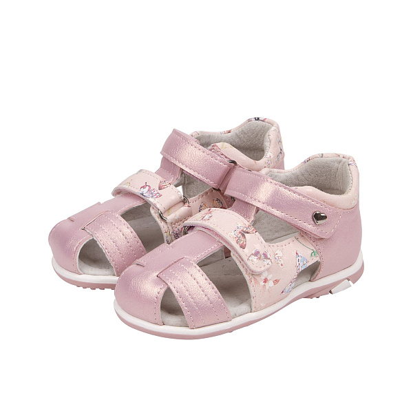 Перламутровые розовые сандалии для девочек подойдут для жаркого лета и чудесно дополнят модный яркий образ. Сочетание однотонной искусственной кожи и принтованной узором из бабочек и цветов придает сандалиям романтический вид. Сандалии застегиваются при помощи ремешков на липучках. Предусмотрено регулирование ширины носовой части и фиксатор голеностопа.
