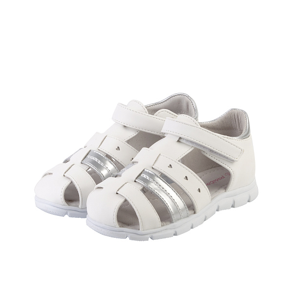 Белые сандалии с серебряными элементами и скромным декором в виде перфорации с сердечками подойдут как для повседневного использования, так и для праздничных нарядов. Мягкая искусственная кожа выглядит привлекательно и легко очищается от загрязнений. Открытые боковые стороны сандалий обеспечивают полноценную вентиляцию ног и комфортный температурный режим.