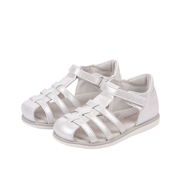 Нейтральные серебристые сандалии для девочки не имеют декора, но от этого они не становятся менее изящными. Привлекательная модель комфортно сидит на ножках, не перелавливая и не натирая. Тонкие боковые ремешки открывают стопы и обеспечивают полноценную вентиляцию. Сандалии застегиваются на липучку. Высокий уплотненный задник обеспечивает устойчивость ног и предотвращает возможное смещение стопы во время ходьбы.