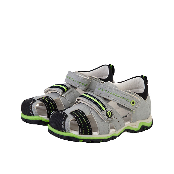 Мягкие замшевые сандалии для мальчиков с высоким задником, специальной формой подошвы и возвышением в зоне пятки предотвращают ортопедические нарушения. Легкая и прочная обувь светлого серого оттенка предназначена для летнего времени года. Сандалии украшены перфорацией, декоративными полосками и строчками лимонного и темно-синего цветов.