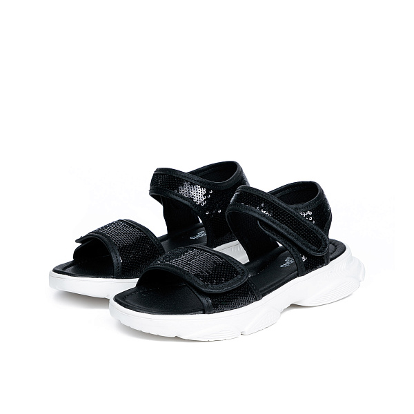Комфортная спортивная модель открытых сандалий для девочек школьного возраста изготовлена из текстильного материала с черными пайетками, придающими обуви нарядный вид.