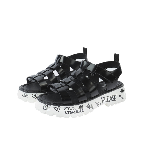 Модные открытые туфли понравятся любой девочке школьного возраста. Модель оформлена с применением контрастных цветов, привлекает внимание интересным переплетением элементов. Для фиксации предусмотрен ремешок с липучкой. Он дает возможность скорректировать посадку обуви. Украшением служат графические надписи, нанесенные в основании изделия.