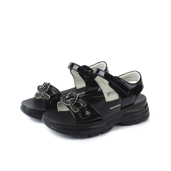 Детские летние открытые туфли для девочек школьного возраста. Модель классического черного цвета. Верхняя часть изготовлена из эффектной лакированной искусственной кожи. На носке декоративный элемент в виде цепочки с крупными звеньями. Застегивается обувь на липучки. Такие застежки помогают быстрее переобуться, а также отрегулировать обувь по ширине стопы.