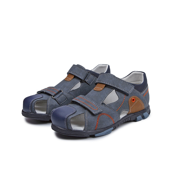 Серые сандалии с яркой оранжевой прострочкой и декоративными коричневыми вставками органично впишутся в летний гардероб мальчиков дошкольного возраста. Наружный слой из фрагментов кожи с разным типом фактур гармонично сочетается с цветом комбинированной подошвы из упругого полимерного материала. Подкладка и стелька обуви отделаны натуральной кожей, которая защищает стопу малыша от сырости и дарит комфорт в течение дня. Сандалии имеют две прочные застежки, одна из которых плотно удерживает обувь на ноге, а вторая позволяет регулировать полноту сандалий. Модель оснащена закрытым носком, который усилен дополнительной накладкой, это позволяет защитить ногу малыша от случайных ударов. Эргономичная форма подошвы обеспечивает правильную постановку стоп при ходьбе.