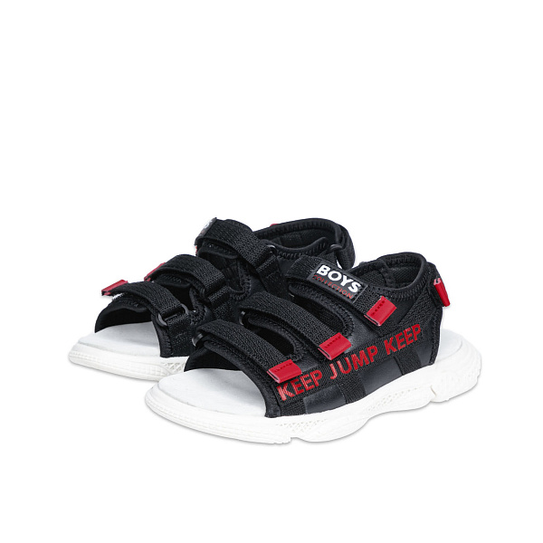 Открытые летние сандалии спортивного типа для мальчиков дошкольного возраста имеют несколько уровней регулировки полноты, которые обеспечиваются плотными застежками-липучками. Практичный черный цвет верха гармонично сочетается с нарядной белой подошвой, а стелька из кожи делает сандалии подходящими для ежедневной носки.