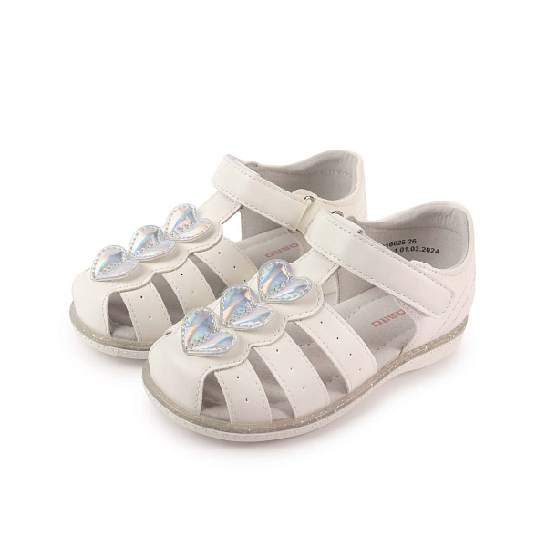 Светлые сандалии для дошкольницы, украшенные декоративными сердечками с голографическим эффектом, точно понравятся маленькой моднице. Теплый оттенок белого цвета придает сандалиям легкость и элегантность.