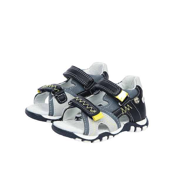Практичные и одновременно нарядные сандалеты оформлены в черно-серой цветовой гамме. Они разработаны с учетом потребностей мальчика ясельного возраста.