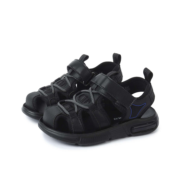 Летние открытые туфли для мальчиков представлены в классическом черном цвете, универсально подходящем к различным нарядам. Верх обуви обогащен небольшими сетчатыми вставками. Удобная застежка на липучке и шнуровка обеспечивают уверенную фиксацию и легкость регулировки под индивидуальные особенности стопы.