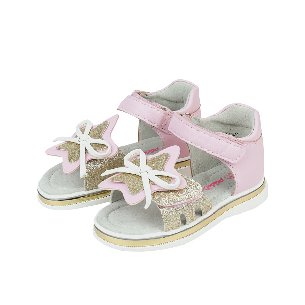 Изящные туфли с открытым носом созданы для девочки ясельного возраста. Модель оформлена в двухцветной гамме, украшена накладками в виде звездочек с бантом.