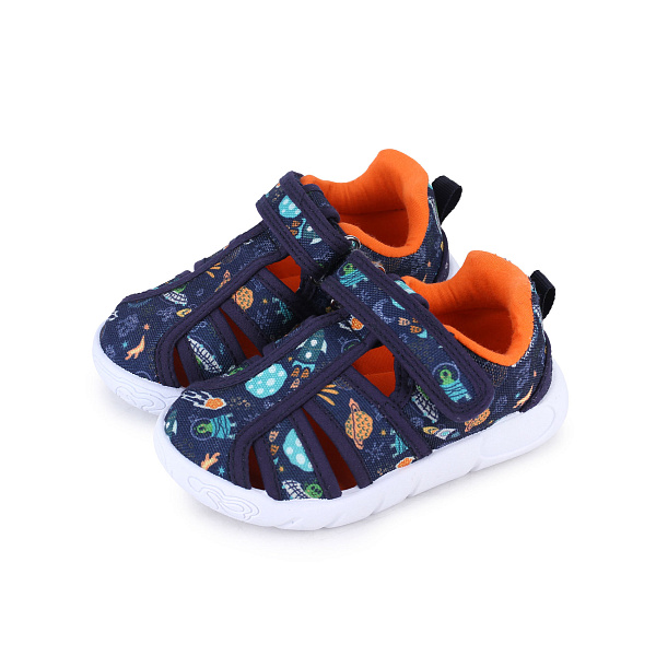Сандалии Pasito на липучке принт космос с оранжевыми вставками синие