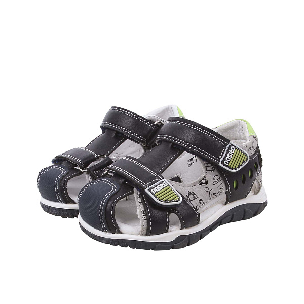 Удобные сандалеты созданы с учетом потребностей мальчика ясельного возраста. Модель привлекает внимание контрастной цветовой гаммой и динамичным дизайном. Усиленный закрытый нос и высокий задник гарантируют комфортную посадку. Для фиксации изделия и корректировки полноты предусмотрено два ремешка с простыми липучками.