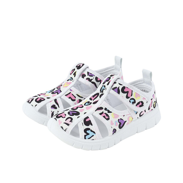 Детские летние сандалии для девочек выполнены в светлых тонах с ярким принтом в виде сердец в леопардовом стиле. Удобные текстильные лямки надежно фиксируют ногу, а застежки-липучки легко регулируют обувь по размеру. Функциональная подошва из ПВХ обеспечивает хорошее сцепление с поверхностью и предотвращает скольжение. Верх изделия выполнен из комбинации 80% хлопка и 20% полиэстера, что гарантирует дышащие свойства и комфорт в жаркую погоду.