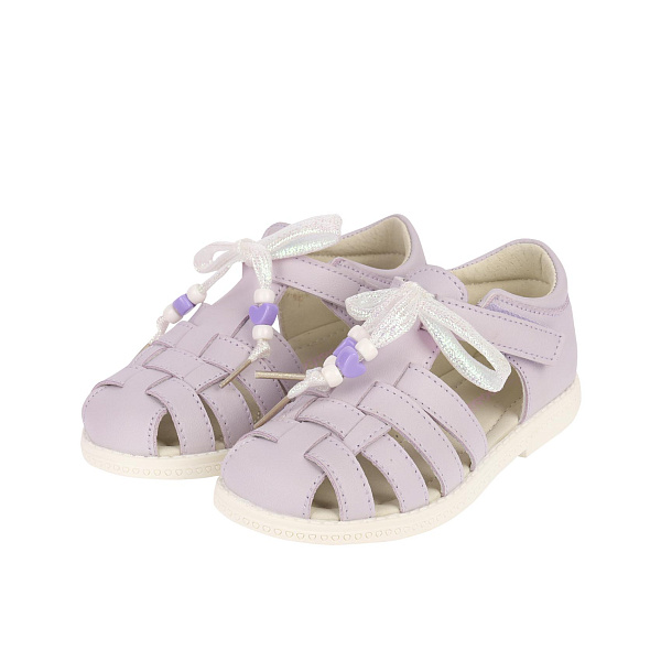 В жаркую погоду вместо закрытой обуви ребенку лучше надеть открытые сандалеты. Их нежный сиреневый цвет подходит для милого образа девочки.