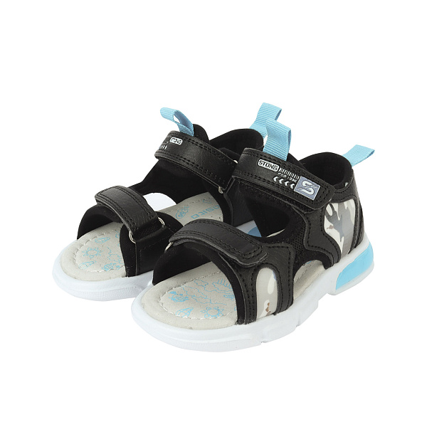 Верх изделия выполнен из искусственной кожи. Подкладка изготовлена из мягкой хлопчатобумажной ткани, а стелька – из натуральной кожи. Рифленая с низким каблуком подошва выполнена из легкого и пластичного материала ЭВА. Цвет верха сандалет - черный, подошла - белая с голубыми вставками.