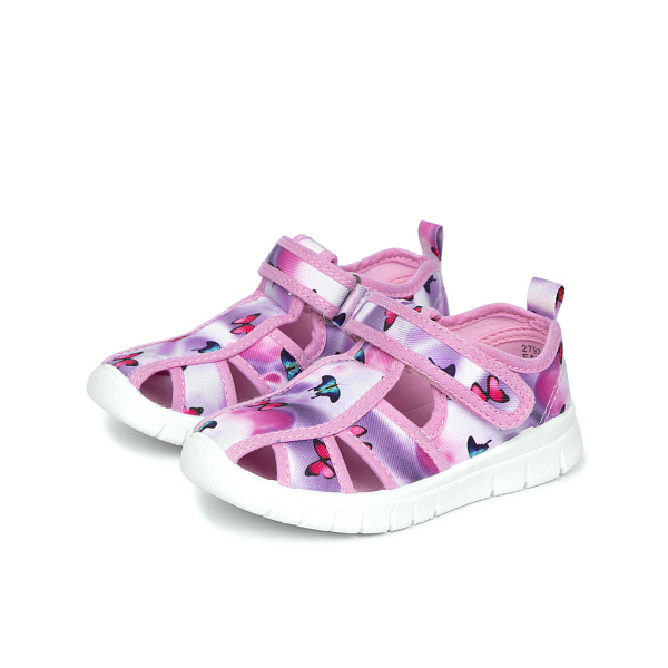 Красивые и яркие сандалеты предназначены для девочки ясельного возраста. Они привлекают внимание сочными красками и изображениями изящных бабочек. Модель можно использовать на улице и в помещении.
