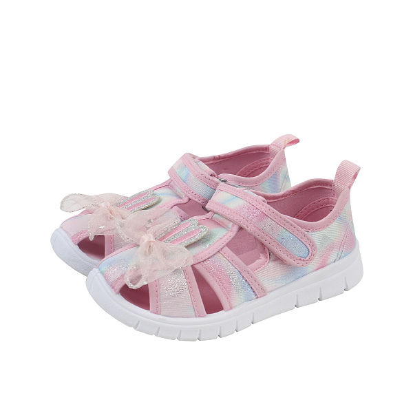 Яркие детские сандалии в нежной пастельной цветовой гамме станут прекрасным дополнением в гардероб маленькой модницы. В основной палитре преобладают нежно-розовый и голубой цвета, плавно перетекающие друг в друга, создавая воздушный и лёгкий образ. Внешний вид модели дополнен милыми декоративными элементами — прозрачными розовыми бантами с серебристой окантовкой. Конструкция с открытым носком и боковыми вырезами обеспечивает отличную вентиляцию, поддерживая прохладу в жаркие дни.