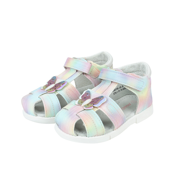 Сандалеты органично впишутся в образ девочки ясельного возраста, обеспечат комфорт во время прогулок в жаркую погоду. Модель оформлена с использованием нескольких цветов, украшена накладками в виде сверкающих бабочек. Высокий задник и закрытый нос гарантируют правильную постановку стопы. Многочисленные фигурные прорези создают все условия для полноценного воздухообмена. Ремешок на липучке упрощает процедуру переобувания, позволяет легко скорректировать полноту.