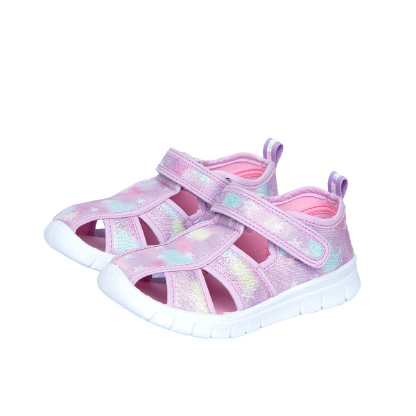 У сандалет есть специальные петельки для комфортного переобувания. Модель изготовлена из легкого, прочного, дышащего, пылеотталкивающего текстиля. Чтобы улучшить износостойкость изделия, придать вещи дополнительную изюминку, тканевые элементы модели обстрочены окантовкой. Подошва создана из ПВХ (поливинилхлорида) – нескользящего и износостойкого материала. Такая комбинация материалов обеспечивает длительный срок службы обуви, делает ее легкой, комфортной для теплой погоды. Ткань верхней части сандалет декорирована рисунками в пастельной цветовой гамме. Такое дизайнерское решение понравится юной моднице. Она почувствует себя принцессой или феей из сказки.