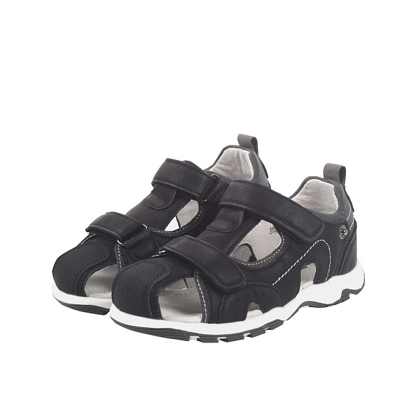 Носок не только закрытый, но и усиленный, поэтому ребенок не разобьет пальцы, случайно запнувшись о камень. Высокий задник прочно фиксирует ногу. Застегиваются сандалеты на двойную липучку «велкро». Подошва на невысоком каблуке имеет рифление, облегчающее хождение по песку или рыхлой земле. Цвет изделия – черный с белой подошвой.