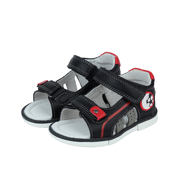 Для прогулок в жаркий день неутомимому малышу необходимы легкие и удобные туфли. Модель с открытым носом и дополнительными прорезями в полной мере отвечает всем потребностям ребенка. С помощью пары липучек несложно скорректировать полноту и надежно зафиксировать обувь. Высокий задник с мягким краем обеспечить правильную постановку стопы. В качестве украшений использованы контрастные детали и накладка с изображением футбольного мяча.