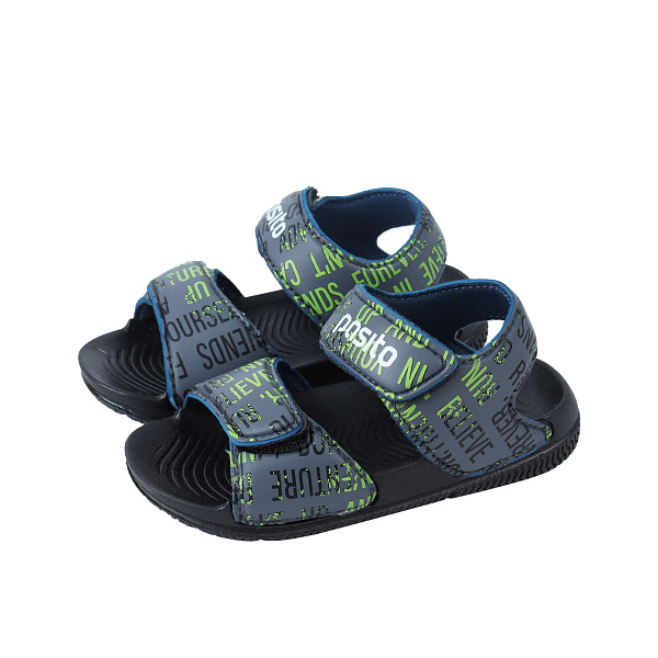 Стильные сандалеты для мальчиков дошкольного возраста, в расцветке преобладает строгий черным. Обувь декорирована фирменными надписями, выделенными на общем фоне зеленым и белым.