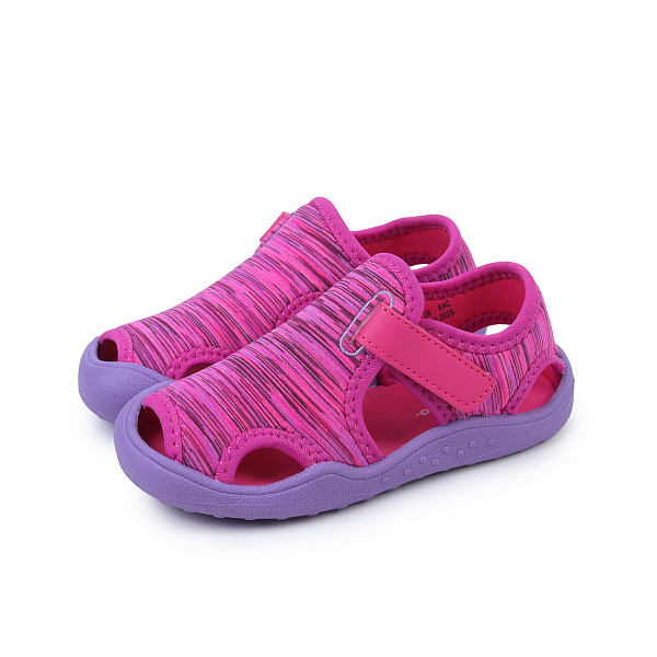 Сандалии пляжные для девочек — это яркие и удобные сандалии в розово-фиолетовой цветовой гамме с текстурным верхом, которые идеально подходят для прогулок по песку или бассейну. Верх выполнен из дышащего текстиля, а мягкая подошва из ЭВА обеспечивает комфорт и устойчивость при ходьбе. Широкая липучка надежно фиксирует обувь на ноге, а открытый носок и пятка делают ее идеальной для жаркой погоды.