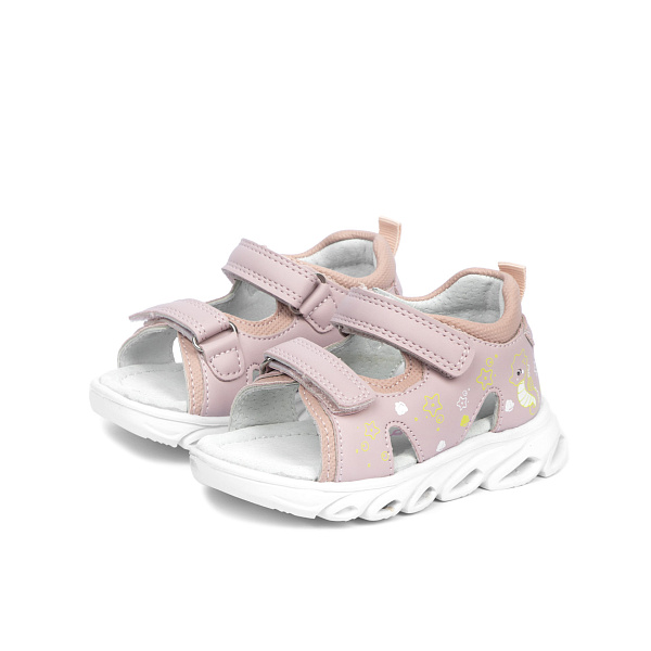 Легкие розовые сандалеты предназначены для девочки ясельного возраста. При создании модели учтены все анатомические особенности и потребности ребенка. Высокий фиксирующий задник с мягким краем гарантирует правильную постановку стопы. Два ремешка с липучками и направляющими упрощают процесс переобувания, позволяют без труда скорректировать полноту.