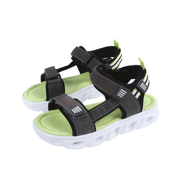 Открытые туфли для мальчиков на лето. Верх обуви, подкладка и стелька изготовлены из текстиля с дополнительными вставками из искусственной кожи. Основной цвет сандалий – коричневый, он эффектно сочетается с элементами салатового цвета и ярко-белой подошвой.