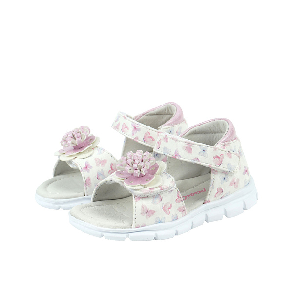 Нарядные и легкие сандалии предназначены для девочки ясельного возраста. Модель оформлена в нежной бело-розовой гамме, имеет открытый нос и прочную застежку в виде липучки. В передней части изделие украшено объемным цветком. Закрытый задник с мягким верхним краем обеспечивает правильную постановку стопы. Рельефная подошва в меру упруга, не скользит на дорогах. Верх изготовлен из искусственной кожи. Материал не препятствует естественной циркуляции воздуха, легко отмывается от пыли и загрязнений. Подкладка и стелька из натуральной кожи. . Подошва из ЭВА не утяжеляет сандалии и равномерно распределяет нагрузку на стопу.