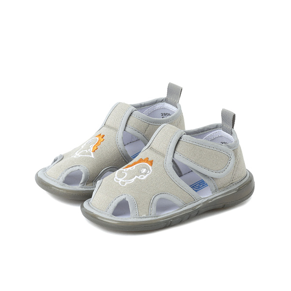 Качественные и удобные сандалеты для мальчиков на лето. Обувь выполнена из износостойкой ткани бежевого оттенка. Спереди на ней вышито изображение динозавра. Если ваш ребенок неравнодушен к рептилиям, такая обувь точно придется малышу по душе. Модель застегивается на липучку. За правильную поддержку ступни ребенка отвечают увеличенный задник, уплотненная пятка и амортизирующая стелька. Подошва выполнена из прочных, но эластичных материалов. В мыске сандалий есть отверстия, обеспечивающие хорошую вентиляцию