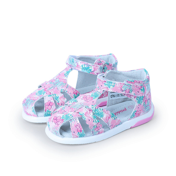 Сандалии для девочек ясельного возраста подойдут для жаркой летней погоды или для ежедневной носки в закрытом помещении. Подкладка обуви и стелька изготовлены из кожи, которая является подходящим материалом для детской обуви. Верх сандалий изготовлен из износоустойчивой кожи с нанесенным ярким растительным орнаментом. При этом сандалии снабжены специалльными подушками на внутренней стороне стельки, жестким ортопедическим задником и застежкой-липучкой. Такая обувь способствует формированию правильной стопы у детей и распределению нагрузки на свод стопы. Подошва из упругого полимерного материала не скользит на сырой поверхности.