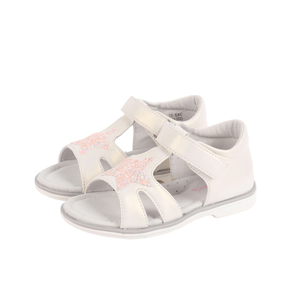Нарядные сандалеты с радостью будет носить любая девочка дошкольного возраста. Они успешно справятся с ролью уличной или сменной обуви, будут незаменимы на прогулке или празднике. Модель с открытым носом привлекает внимание нежными переливами перламутра и сверкающей звездой. Ремешок с липучкой надежно удерживает туфли на ноге.