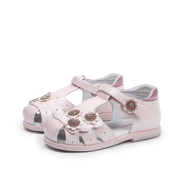Розовые сандалии для девочек ясельного возраста чудесно впишутся в летний гардероб. Модель украшена объемными цветами на передней поверхности и застежке-липучке. Внешний слой сандалий изготовлен их кожи, а внутренняя отделка и стелька обуви – из 100% натуральной кожи. Модель имеет закрытый носок и ортопедический жесткий задник, на внутренней стороне стельки имеются специальные подушечки, что обеспечивает правильное положение ноги ребенка при ходьбе и формирует правильную форму. Подошва из упругого полимерного материала приподнята на небольшой каблучок, протектор имеет противоскользящий рисунок.