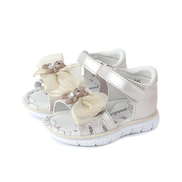 Милые детские сандалеты для девочек ясельной группы. Модель бежевого цвета с красивым жемчужным блеском. Мысок украшают большие банты из фатина с фигурками маленьких медвежат. Обувь смотрится нарядно, торжественно и будет хорошо сочетаться с праздничными платьями и костюмами.