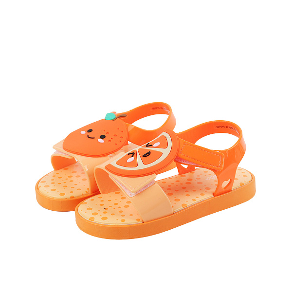 Сандалии состоят из плоской подошвы и верха из двух перемычек, поддерживающих пятку и носок. Они крепятся к ноге липучками с яркими дольками апельсина.