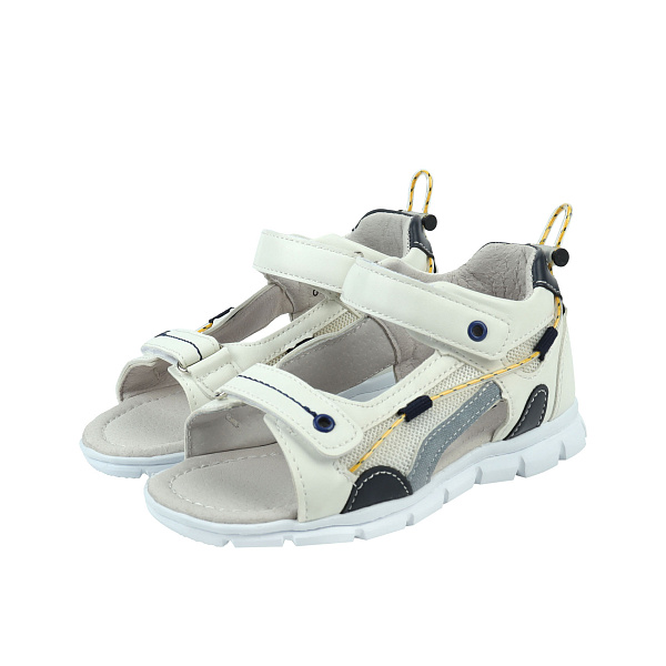 Детские сандалии для мальчиков дошкольного возраста изготовлены из кожи. Комфортная модель дополнена двумя застежками-липучками, чтобы ребенок мог одеваться в детском саду без помощи взрослых, самостоятельно регулируя объем и ширину по ступне. Подошва изделия изготовлена из материала ЭВА, который не утяжеляет обувь и препятствует скольжению, а прочный закрытый задник зафиксируют стопу в правильном положении. На пятке имеется фиксатор, который позволяет детально регулировать полноту обувь. Родители оценят прочный пошив сандалий полузакрытого типа, а яркий декор с комбинацией белого, серого и желтого точно понравится маленьким непоседам.