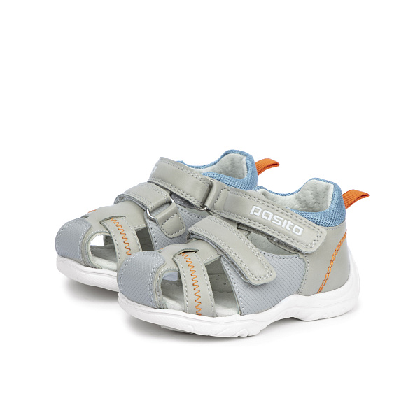 Легкие сандалеты предназначены для мальчика ясельного возраста. Они созданы с учетом потребностей ребенка, оформлены в нейтральной цветовой гамме. Украшением изделия служит декоративная строчка оранжевого цвета и графическая надпись на застежке.