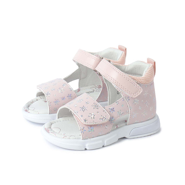 Детские модные сандалеты для девочек. Модель розового цвета с узором в виде маленьких серебристых снежинок. У нее плотный закрытый задник, который поддерживает ногу ребенка в правильном положении. Застегивается обувь на две удобные липучки, которые значительно ускоряют процесс переобувания ребенка. Носить можно как сменную пару в детский сад, на утренники, а также в теплую погоду на улице.