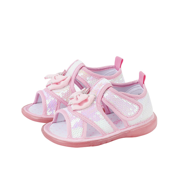 Даже самые маленькие девочки любят наряжаться, и эти сандалеты созданы специально для них. Модель розового цвета, расшитая блестящими пайетками и украшенная миниатюрным бантом. У нее круглый открытый мысок. Высокая пятка для фиксации ноги в правильном положении при ходьбе. Подошва из прочного и эластичного материала амортизирует ногу при ходьбе. Удобная застежка на липучке позволяет быстро снимать и надевать обувь.