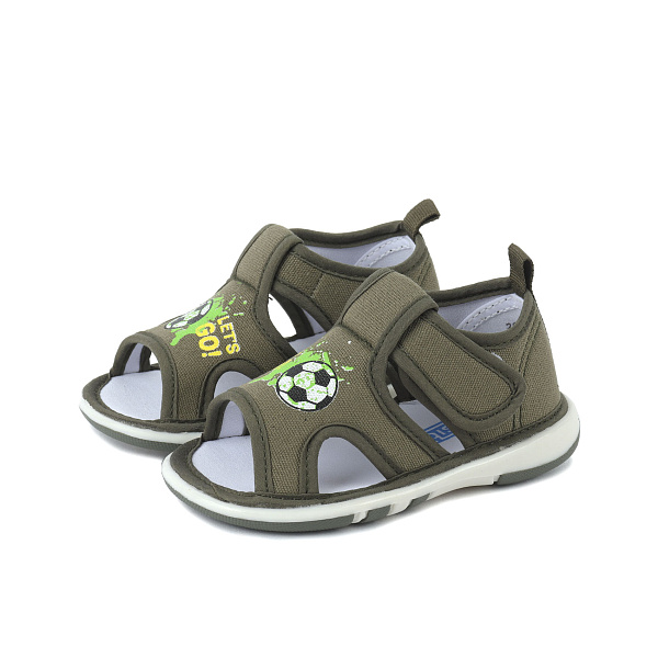 Детские сандалии для самых маленьких. Это базовая повседневная модель, выполненная с учетом особенностей строения неокрепших детских ног. В них удобно гулять, ходить в детский сад и бегать на детской площадке. На ноге сидят комфортно. Застежка на липучке не дает им слететь с ноги. Основной материал болотного цвета с рисунком в виде футбольного мяча. Ткань прочная, хорошо скрывает загрязнения, неприхотлива в уходе. У модели открытый мысок, благодаря чему ступня будет чувствовать себя комфортно даже в жару. Задник увеличен, а пятка дополнительно уплотнена. Обувь очень легкая, подошва эластичная, сгибающаяся при ходьбе.