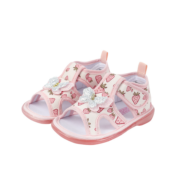 Милые летние сандалеты для девочек. Модель выполнена в любимой маленькими модницами розовой цветовой гамме. У обуви рисунок в виде спелых ягод клубники. На мыске пришита объемная декоративная бабочка. Застежки надежно фиксируют обувь на ноге с помощью липучек. Высокая усиленная пятка поддерживает стопу в правильном положении.