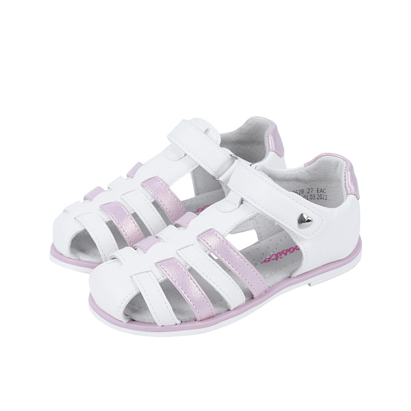 В жаркий летний день на прогулке, на даче, на пляже девочке пригодятся легкие и удобные сандалии, в которых можно комфортно гулять. Верх сандалий изготовлен из искусственной кожи, подкладка и стелька – из натуральной. Рифленая подошва с низким каблуком выполнена из термопластичной резины. Задник сандалий закрытый, верх носовой части состоит из кожаных полосок, закрепленных на мыске. Застегиваются сандалии эластичным ремешком «велкро». Такая застежка плотно фиксирует обувь на ноге и облегчает переобувание. Расцветка обуви белая с розовыми элементами, а застежка декорирована металлическим сердечком серебристого цвета. Рекомендовано для детей дошкольного возраста.
