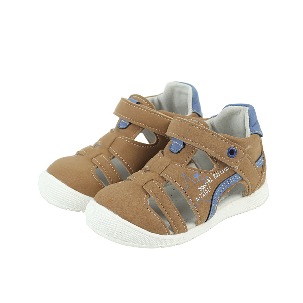 Для активных прогулок и игра ребенку необходимы прочные и комфортные сандалии. Кожаный верх коричневых сандалий не склонен в появлению царапин и потертостей, по бокам имеются прорези. Носок и задник обуви закрыт, за счет чего нога будет формироваться правильная форма свода стопы. Подкладка и стелька выполнены из натуральной кожи, материал мягкий и эластичный, приятен к коже. Белая подошва из ТПР препятствует скольжению, не оставляет полос на полу и равномерно распределяет нагрузку благодаря упругости материала. Застегивается обувь на липучке, она облегчает обувание и плотно фиксирует обувь на ноге. Завершают дизайн синие вставки, контурный рисунок звезды и белая надпись. Рекомендовано для детей ясельного возраста.