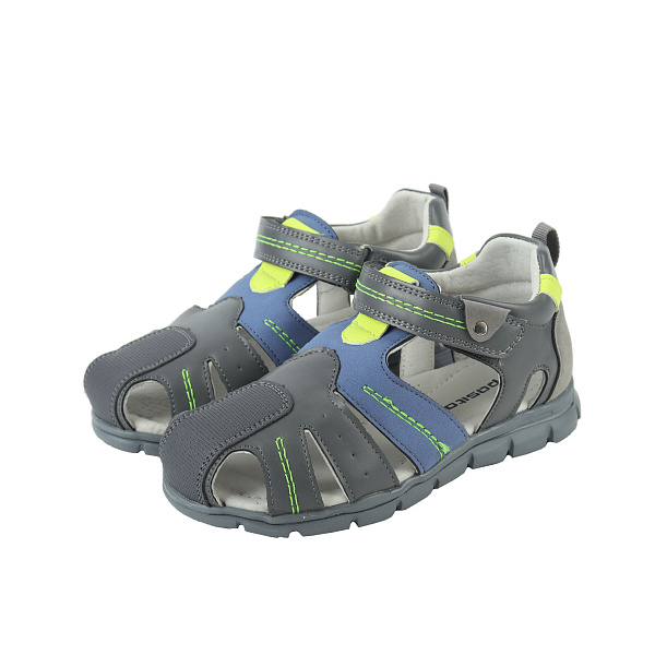 Открытые сандалии подарят комфорт детской ноге и дополнит гардероб ребенка. Верх сандалий пошит из искусственной кожи и прорезями по бокам. Носок и задник зарытые, они помогут сформировать правильную форму свода стопы и плотно зафиксировать ногу в обуви. Подкладка и стелька из натуральной кожи мягкие и эластичные, приятно прилегают к коже и дарят комфорт в носке. Серая подошва из ЭВА не утяжеляет ботинок, она упругая и эластичная. Обувь выполнена в сочетании серого, синего и желтого цветов с зеленой прострочкой. Для застежки использована липучка, она плотно фиксирует обувь на ноге и облегчает обувание. Рекомендовано для детей дошкольного возраста.