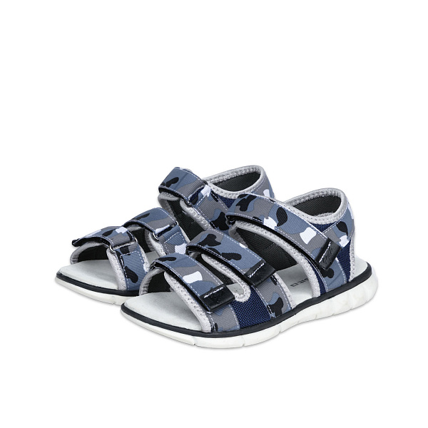 Нарядные летние сандалии для мальчика изготовлены из нескольких цветов денима и декорированы вставками из черной кожи. Белая полимерная подошва с фактурным рисунком по краю отделана темным кантом. Такое цветовое сочетание позволяет подобрать к обуви наряд в спортивном или городском стиле.