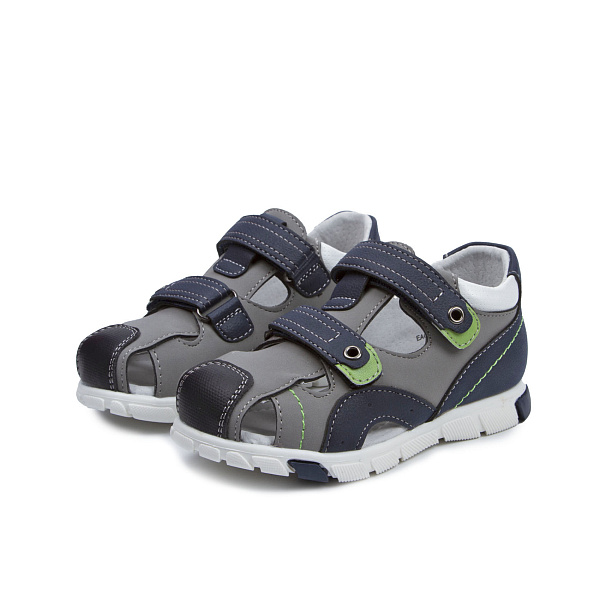 Стильные комбинированные сандалии для мальчиков ясельного возраста чудесно подойдут к летнему гардеробу. Модель оформлена в сочетании серого и зеленого цветов. В качестве декоративных элементов использована цветная прострочка и заклепки. Наружный слой обуви изготовлен из кожи с оригинальной фактурой. Подкладка сандалий, как и стелька, изготовлена также из кожи. Для комфортного обувания модель снабжена двумя прочными застежками-липучками, которые позволяют регулировать полноту обуви. Закрытый носок и высокая жесткий задник выполняют ортопедическую функцию, а специальные подушки под стелькой помогают правильно распределить вес при ходьбе, и ноги ребенка меньше устают. Протектор имеет противоскользящий рельеф.
